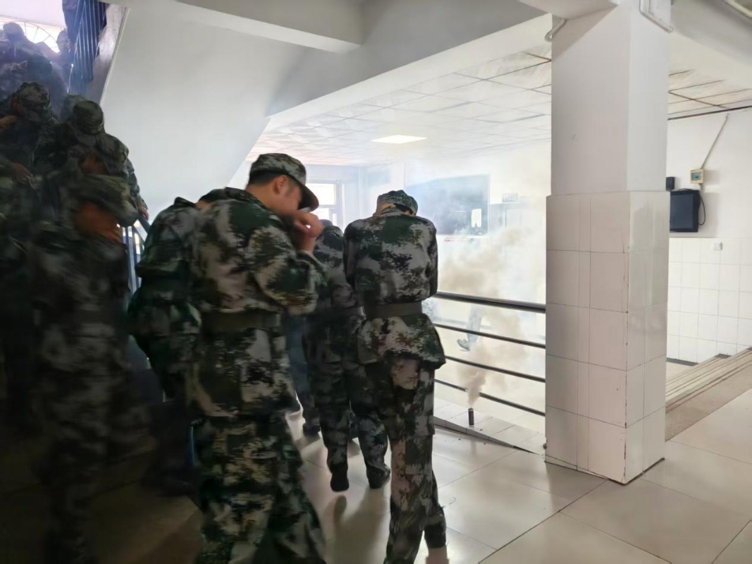 演练开始后,烟雾报警器迅速触发,广播系统立即播报火情警报与疏散指令。各班级辅导员、班干部快速组织学生用湿毛巾捂住口鼻,弯腰低姿沿疏散通道有序撤离,全体人员安全抵达指定集合点。